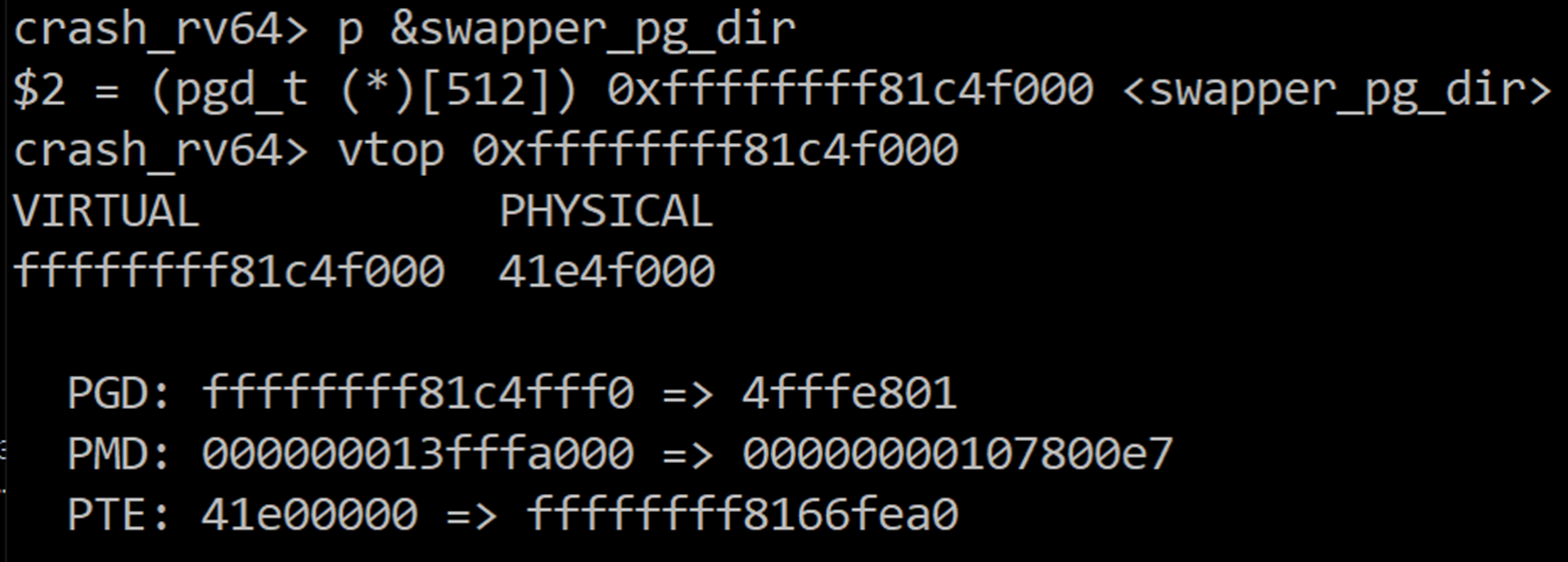 Crash 유틸리티를 사용하면 swapper_pg_dir의 가상 주소와 물리 주소를 확인할 수 있습니다.
