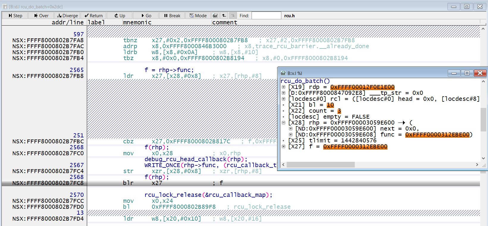 rhp->func에 0xffff0000312ebe00 주소가 저장되어 있어서 익셉션이 유발됐습니다.