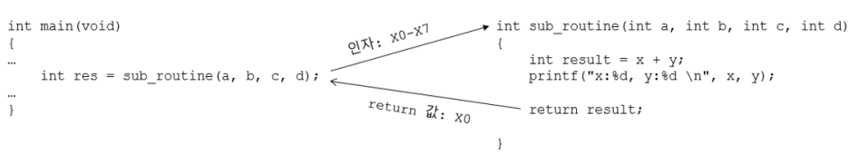 그림 7.2 함수가 호출될 때 사용되는 X0-X7와 X0 레지스터