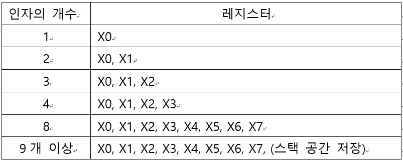 표 7.2 함수에 전달되는 인자의 개수별 사용되는 레지스터