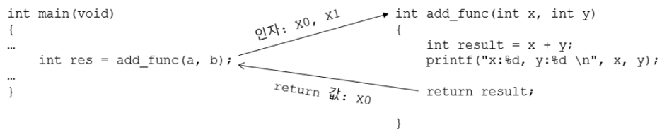 그림 7.3 add_func() 함수가 호출될 때 사용되는 X0-X1와 X0 레지스터