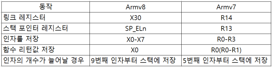 Armv7 아키텍처에서는 4개의 함수 인자까지만 R0-R3 레지스터에 저장됩니다. 하지만, Armv8 아키텍처에서는 8개의 함수에 전달되는 인자까지 X0-X7 레지스터에 저장됩니다.